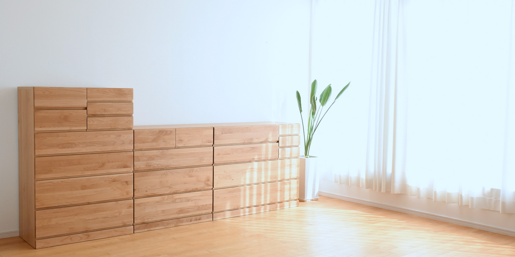 国産・天然木を中心に、長く使えることを大切にしたデザインと品質にこだわり、こたつやチェスト、デスクなど多彩なラインナップを展開。