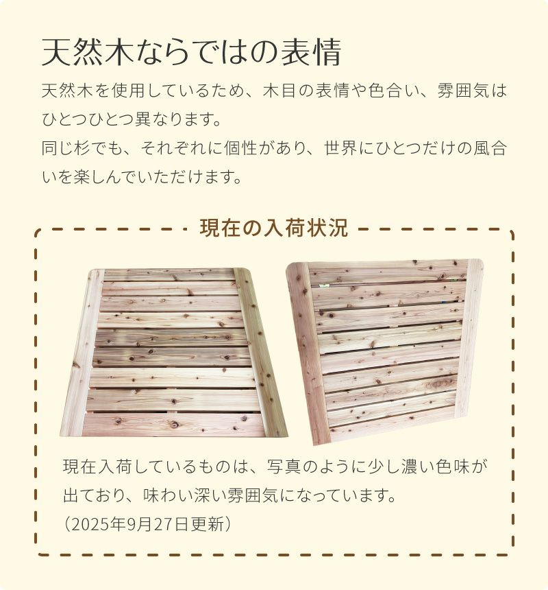 他の画像を見る 在庫限りで終了 敷ふとんにもマットレスにも合う高さ 深い眠りにみちびく杉のベッド ベッド すのこ 杉 セミダブル 敷ふとん用高さ40cmベッドフレーム 国産 無垢 天然木 無塗装 スノコ 日本製 ナチュラル SD 敷布団に ビッグモリーズ bigmories BMオリジナル 送料無料 3年保証 国産 レビューキャンペーン対象 販売価格 ¥ 132,000 税込 在庫切れ お気に入りに登録する