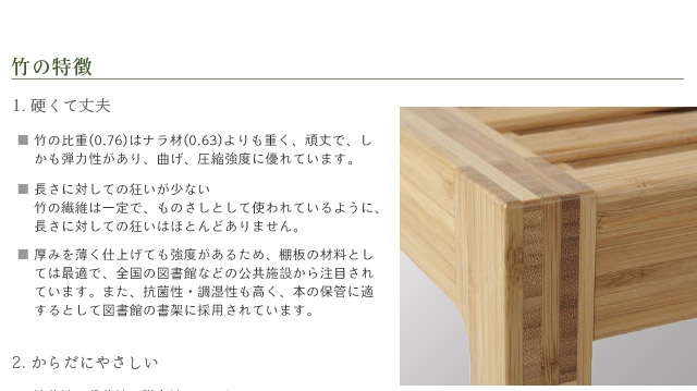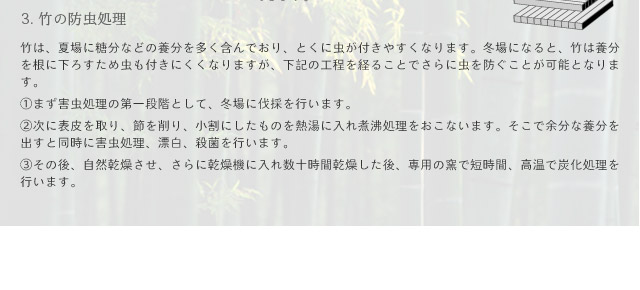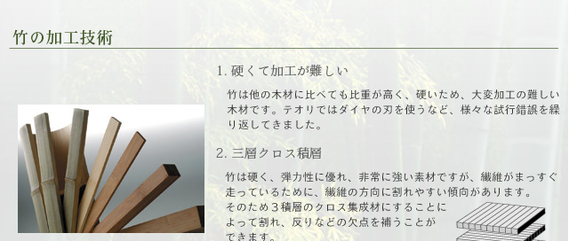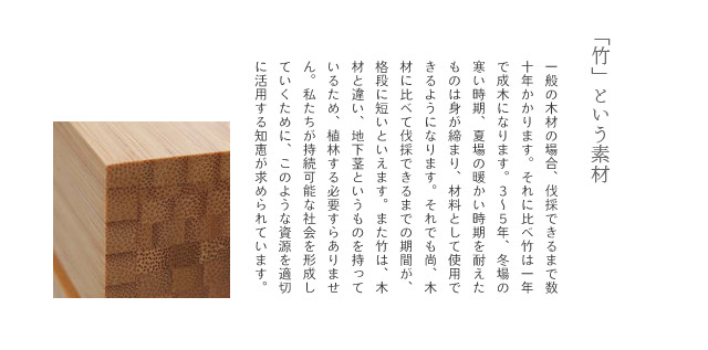 ■ 竹は成長が早く、地下茎とよばれる茎を地中に持つため、地上に生えたものだけを伐採すれば、持続的生産が可能。森林伐採が社会問題となっている現在、竹はとても注目されている素材です。