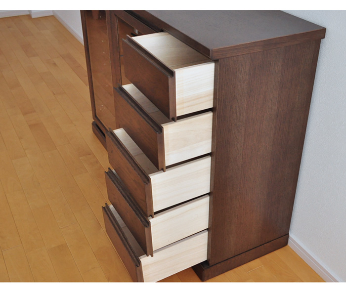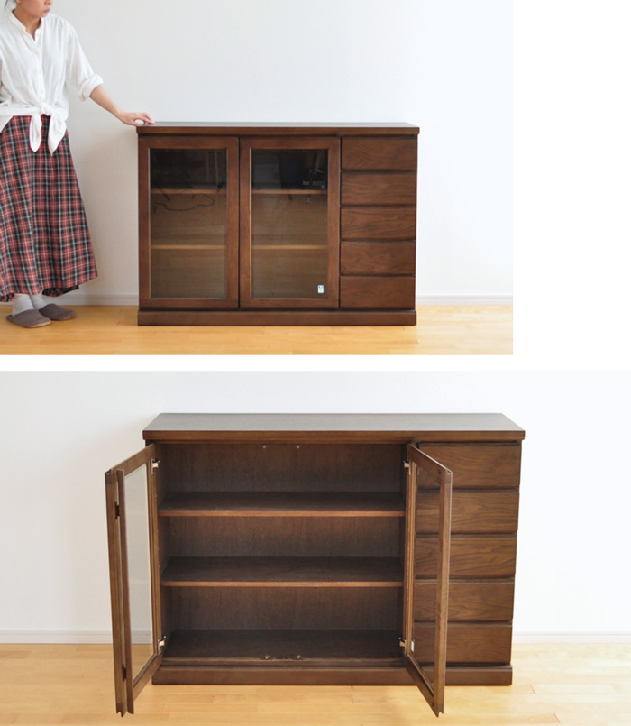 向かって右に引出し、左にガラス開き戸のサイドボード。