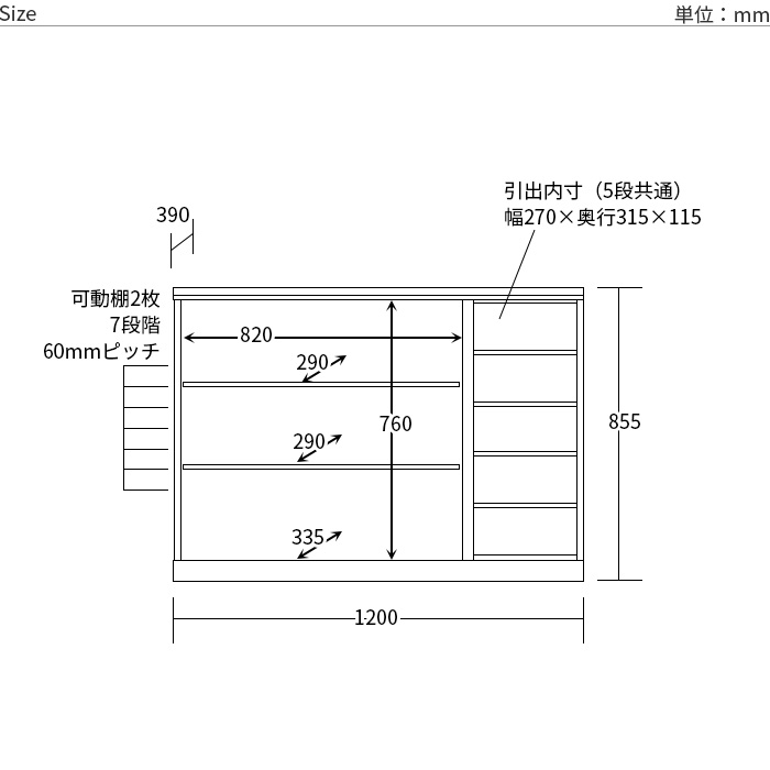 幅120×奥行39×高さ85.5cm 扉内内寸:幅82×奥行33.5×高さ76cm 引出内寸:幅27×奥行31.5×高さ11.5cm