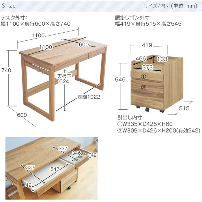 デスクやワゴンの引出しには、板と板をくさび状に組み合わせる「あり組み」の工法が使われています。これは高級たんすに使われる技術と同じ。 すみずみまで心が行き届いたつくりです。