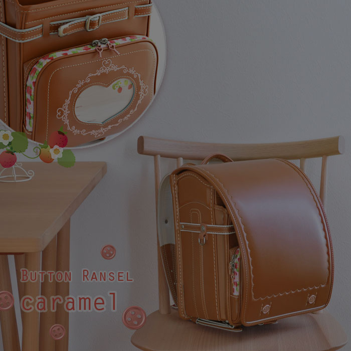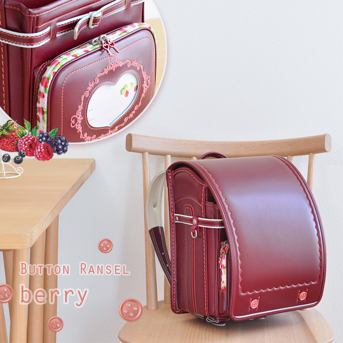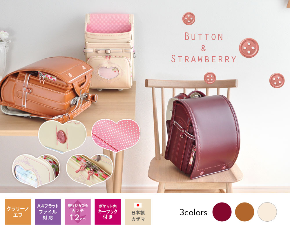 スイーツカラーが3つ勢ぞろい!ボタン型の鋲がコロンとキュート。 チラ見せのイチゴ柄がポイント。