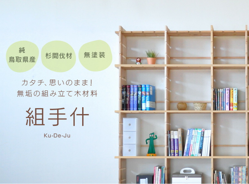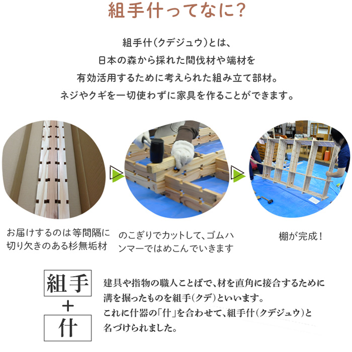 釘やネジを使わず、はめ込むだけで棚やラックがつくれる木製パーツ組手什(くでじゅう)。