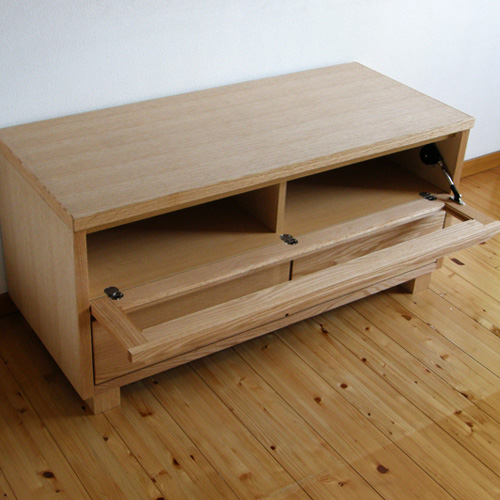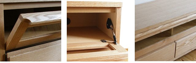・扉や前板は天然木。自然塗装だから木の風合いが生きています。フラップ扉は手を離すとゆっくり開きますので安心です。