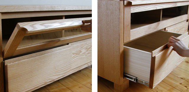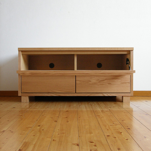 ・引き出しはフルオープンレール付き。 いっぱいに収納しても奥のものが取り出しやすくなっています。 ・ DVDのケースが2列に入ります。 しっかりとした箱組みの構造。(箱型に組んだ枠にさらに前板を取り付けています。) 前板が外れにくく、長くお使いいただけるつくりです。