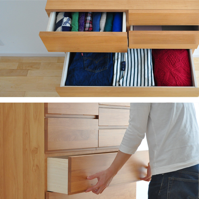 引出しの高さは、上にいくほど浅くしてすっきりと。