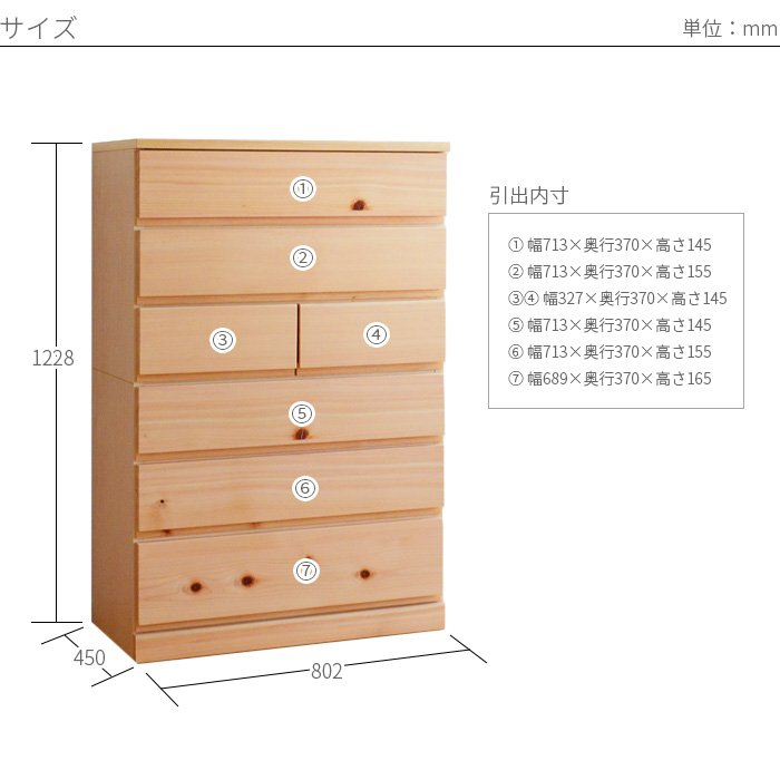 前板:鳥取県産ひのき無垢材(自然オイル塗装) 天板・側板:シナ突板 引出:桐材 引出底板:桐突板両面張り(5.5mm) 地板両面:プリント化粧板