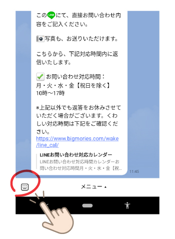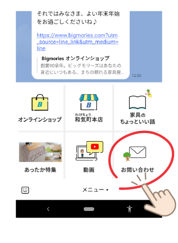 友だち追加後、トップ画面のメニュー右下の「お問い合わせ」をタップ