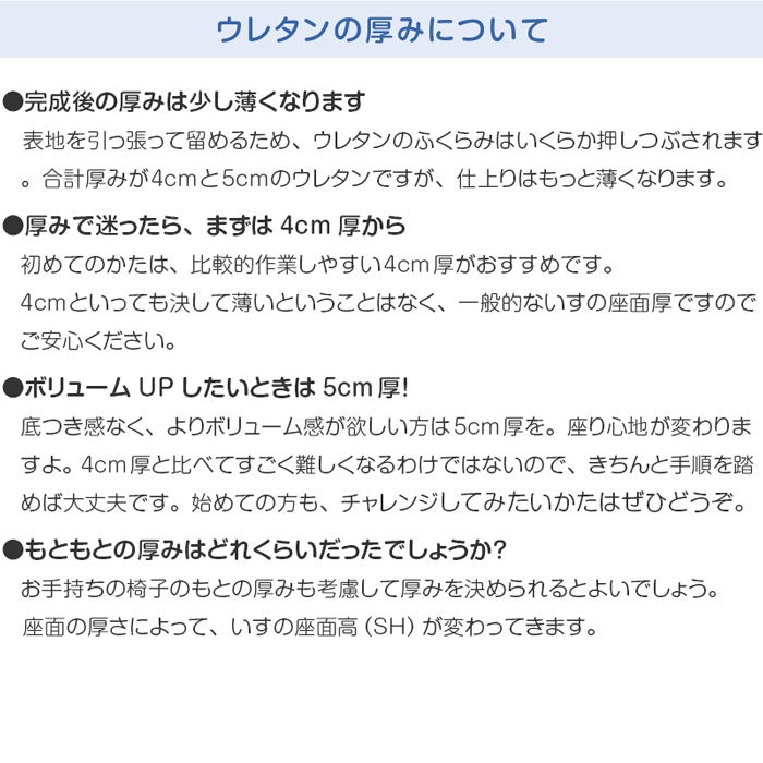 他の画像を見る 座幅100cmまで対応 ・1脚分カット済 表地+ウレタン+不織布のセット 幅広 いすはりーず ベンチサイズ/ 椅子の張り替え セット 布 無地【4cm厚】【1脚分】キャンバス 布地 生地 キット いす DIY イス 座面 張り替え 日本製 国産 修理 椅子 張替え はりかえ 貼り替え 送料無料 レビューキャンペーン対象 販売価格 ¥ 7,090 税込 詳細を見る お気に入りに登録する