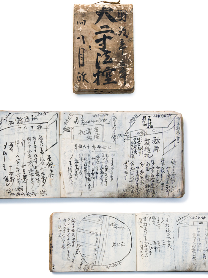 寸法や材料、仕様などが細かく記された台帳。杉工場創業者の杉平三郎氏が書いたものです。裁縫机、テフル(テーブル)などの文字が読み取れます。
