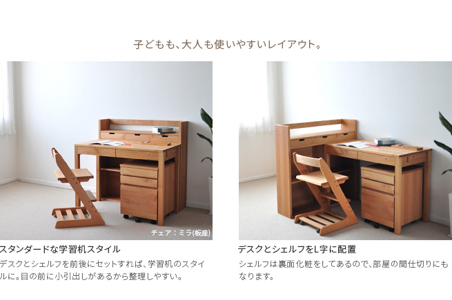 例えば、小学生のうちはコンパクトな形で使い、成長に合わせて棚を追加したり、兄弟で並べて使ったり。