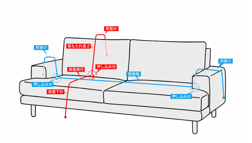 マルチカバーのサイズを考えるときは、「ソファ全体を一気に測る」のではなく、いくつかのパーツに分けて考えると、ぐっと分かりやすくなります。