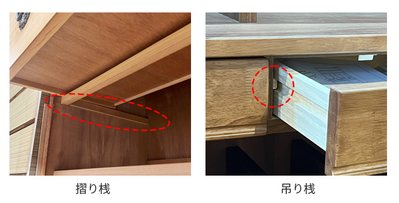 イメージとしては、摺り桟は「滑り台のレール」、吊り桟は「引出しを落とさないための受け」に近い存在です。