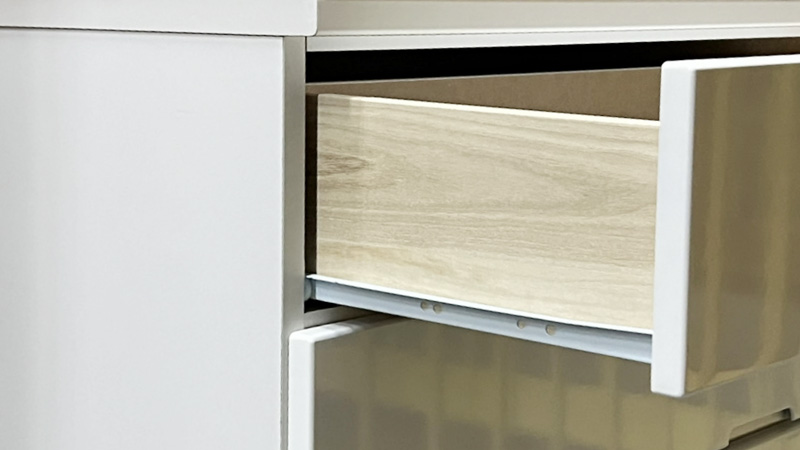 最近は、スムーズさを売りにした金属レール付きの引出しが主流になっています。