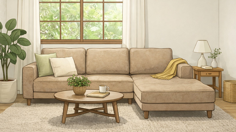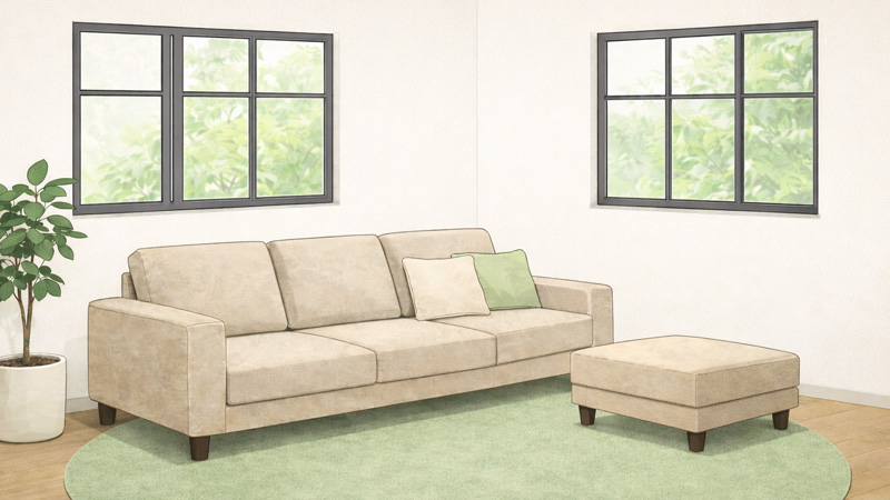 カウチソファは一般的な2〜3人掛けより奥行と幅が大きく、設置スペースを確保できるかが最初のポイントになります。