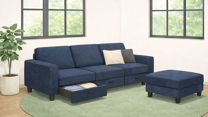 座面下が収納スペースになっている収納付きソファは、限られた空間でも物をすっきり収められる人気のタイプです。