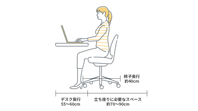 椅子の奥行きが約40cmほどあり、さらに椅子を引いて座るための余裕も考えると、机の前には120〜140cmほどの奥行きがあると安心です。